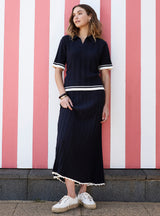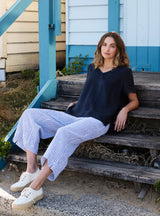 Slip into effortless evening comfort with our Short Sleeve Pyjama Set in Navy. This refined set pairs a short sleeve shirt with a long, full-length pant, finished with contrast satin binding and satin-covered buttons for an elevated touch.